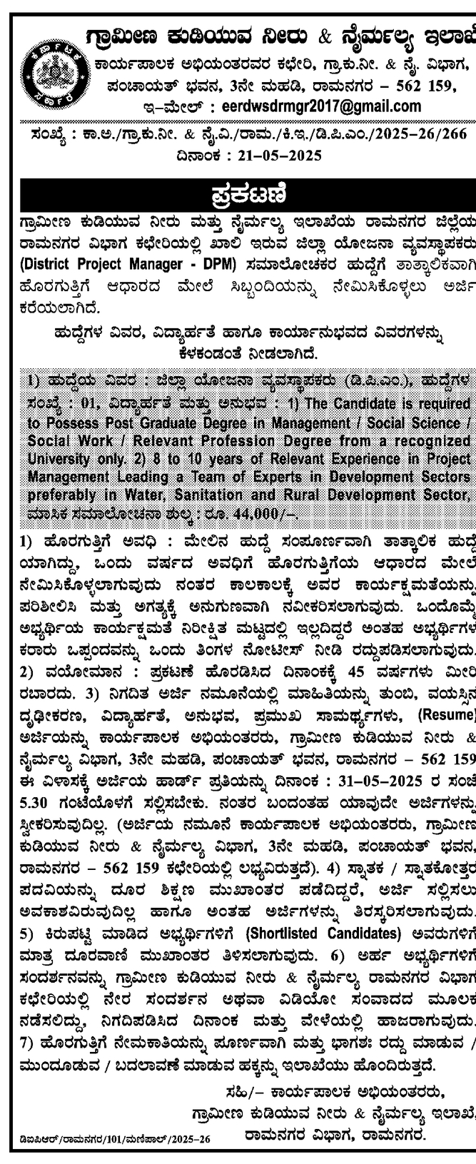 How to Apply: Interested and eligible candidates duly filled in application form along with along relevant documents. Address: Office of Executive Engineer, Rural Drinking Water & Sanitation Department, 3rd Floor, Panchayat Bhavan, Ramanagara – 562159, Karnataka